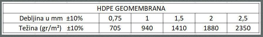 HDPE GEOMEMBRANA, je izolacioni materijal sa veoma širokim opsegom primene u putnim i železničkim konstrukcijama, opštinskim investicijama (npr. Za zaptivanje objekata za odlaganje otpada). HDPE GEOMEMBRANE koje su trajno ugrađene u zemlju imaju različite funkcije koje proizilaze iz projektnih pretpostavki npr. poboljšanje fizičkih i mehaničkih svojstava građevinskog zemljišta, jačanje stabilnosti kosina, promena vrednosti i pravaca filtracije podzemnih voda, stvaranje čvrstih vodootpornih i nepropusnih barijera u zemljištu. Sve geosintetičke polimerne barijere dostupne su u glatkoj i teksturiranoj verziji. Dokumenta koje prate geomembranu su atesti i sertifikati o kvalitetu robe u svemu prema važećim Evropskim standardima za ovaj material.
